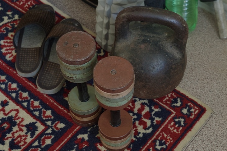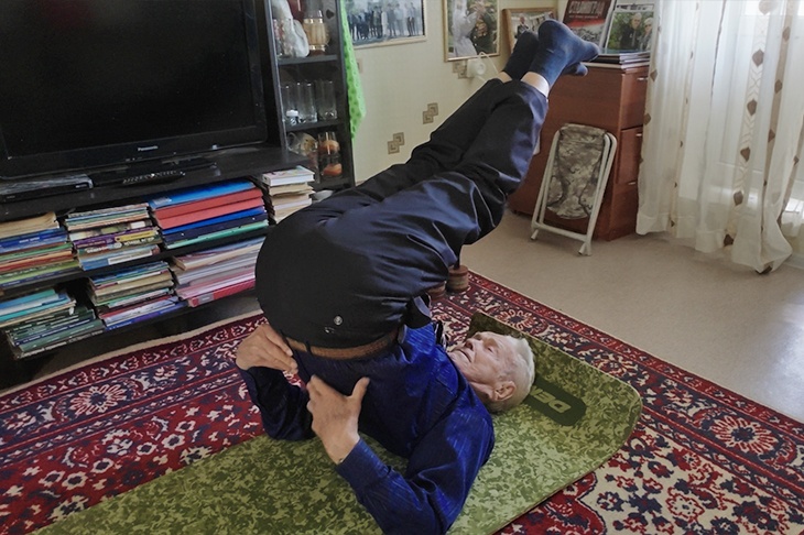 От слов 99-летний ветеран войны быстро переходит к делу. Свою разминку он начинает с подъема гантелей и упражнений на позвоночник. А дальше – его коронные упражнения. Растягивая коврик цвета хаки, Александр Медков показывает нам стройную «березку» - поднимает ноги и без особых усилий вытягивается в струнку.