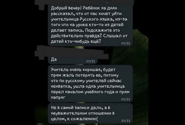 – Все началось с того, что ребенок этого родителя, ещё обучаясь в первом классе, бежав на перемене, упал и ударился. После этого и по сей день родитель не унимается. В падении, по его мнению, был виноват учитель. Мужчина неоднократно вызывал проверки, морально давил. Учитель после этого отказался от класса. Но смена учителя ситуацию не изменила, и родитель по-прежнему придирался ко всему, что, по его мнению, было неправильным, – рассказала Анна. – Если случался конфликт между детьми, то он беспрепятственного заходил в школу, подходил к «обидчику» – ученику второго класса, к примеру, – хватал за плечо, тряс и требовал объяснений без присутствия или хотя бы предупреждения его родителей. На данный момент дети учатся уже в шестом классе. На столе у директора стопка заявлений от учителей о том, что они не хотят работать с нашими детьми – в классе, где нарушается дисциплина и субординация. Если не устраивает оценка, то за помощью или беседой к учителю этот родитель не обращается, а дает своему ребенку диктофон, разрешает не выполнять требований учителя, может и сам нагрянуть во время уроков, чтобы проконтролировать действия учителя.