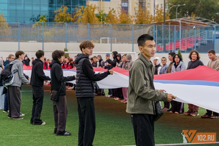 В Волгограде иранские студенты развернули 100-метровый флаг России под песню о Сталинграде. Как сообщает ИА «Высота 102», мероприятие состоялось на стадионе физкультурного комплекса в Дзержинском районе, где 10 октября проходит товарищеский матч между студенческими сборными России и Ирана.