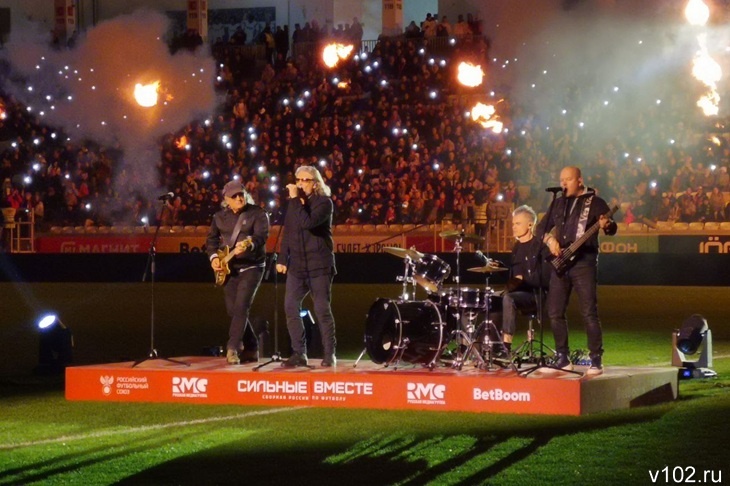 Рок-группа с вокалистом Сергеем Галаниным открыла футбольный вечер на «Волгоград Арене» перед товарищеской встречей сборных России и Ирана. Как передают корреспонденты ИА «Высота 102», после завершения выступления группы перед стартовым свистком матча исполнила гимн России российская и белорусская певица Наталья Подольская.