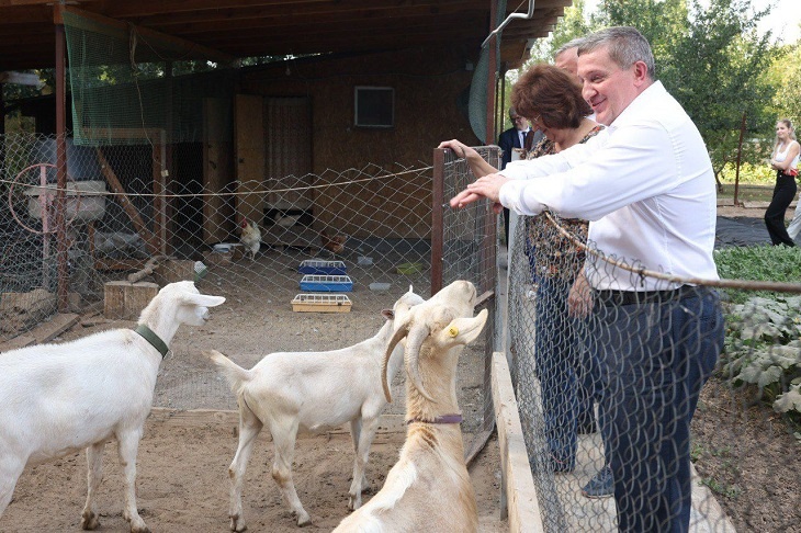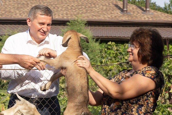 Возвращаясь к братьям нашим меньшим, – следующий снимок сделан в августе 2025 года, во время очередной рабочей поездки Бочарова. Напомним, губернатор летом этого года принимал участие в запуске природного газа в поселке Красный буксир. После официальных мероприятий, предсмотренных рабочей программой, он уделил время местным жителям и с удовольствием познакомился с подсобным хозяйством селян.
