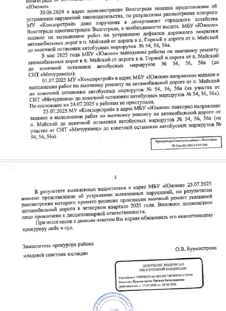 Прокуратура внесла в адрес МБУ «Южное» представление об устранении выявленных нарушений, по результатам которого было принято решение провести ямочный ремонт в четвертом квартале 2025 года. Также было выявлено виновное лицо, которое привлекли к дисциплинарной ответственности.