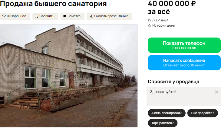 В предложении указано, что бывший заводской санаторий идеально подходит для восстановления, перепрофилирования или строительства нового объекта.