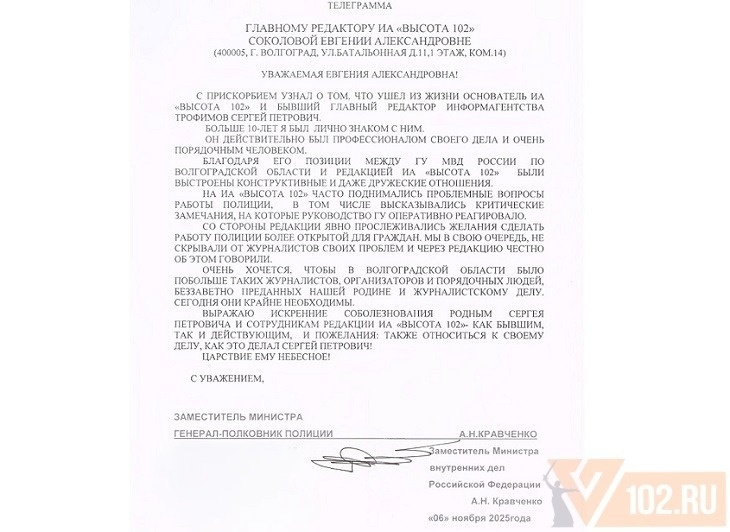 Заместитель министра внутренних дел Российской Федерации генерал-полковник полиции Александр Кравченко выразил соболезнования в связи со смертью журналиста Сергея Трофимова. Телеграмма со словами поддержки в адрес родных и близких за подписью замминистра МВД поступила в редакцию ИА «Высота 102», основателем которого был Сергей Петрович.