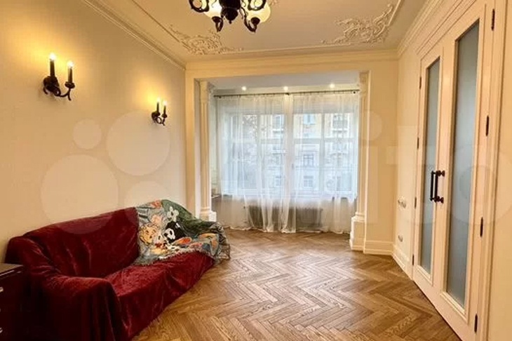 Квартира площадью 90 «квадратов» располагается на втором этаже дома. Каждая комната украшена лепниной, а все элементы декора изготавливались по индивидуальному заказу.