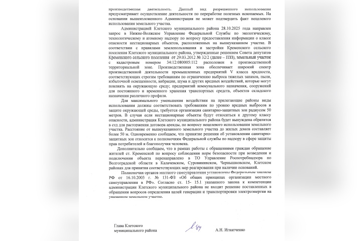 - Администрацией Клетского муниципального района 28.10.2025 года направлен запрос в Нижне-Волжское Управление Федеральной Службы по экологическому, технологическому и атомному надзору по вопросу предоставления информации о классе опасности нестационарных объектов, расположенных на вышеуказанном участке. В случаи, если нестационарные объекты будут отнесены не к V классу опасности, муниципалитет обратится в суд для расторжения договора аренды, по факту нецелевого использования земельного участка, - подчеркивается в официальном ответе.