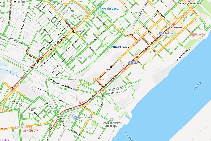 Отметим, что согласно сервису Яндекс Карты, осложнено движение транспорта и в противоположном направлении – в сторону центра. Однако, здесь обстановка более спокойная – скорость движения транспорта составляет около 20 километров в час.