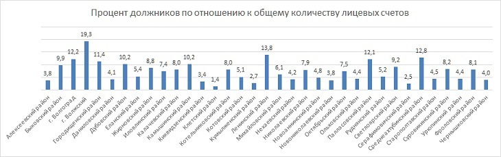 Города и районы, лидирующие по количеству должников (для более точной и объективной картины число должников в процентном отношении соотнесено с общим количеством лицевых счетов в том или ином районе, – Прим.ред.):
