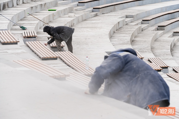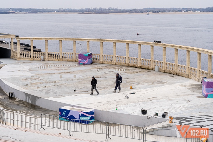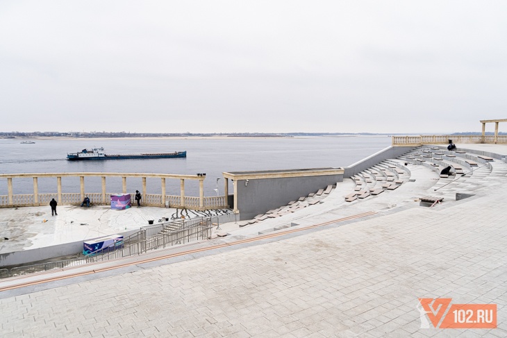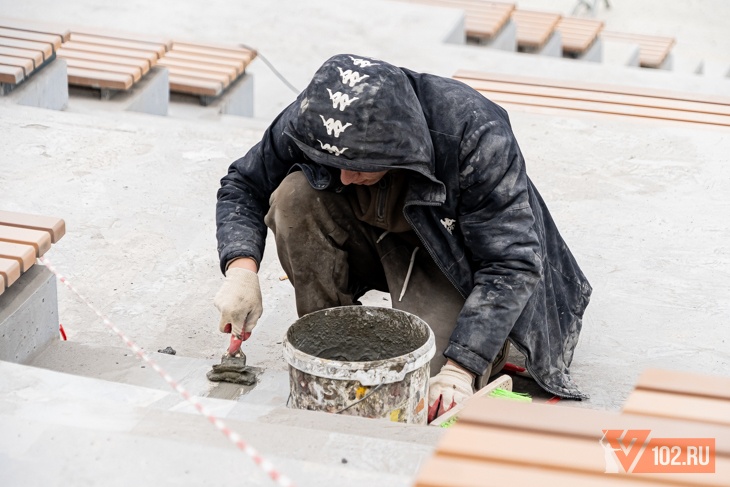 Ремонтные работы кипят на площадке амфитеатра на Центральной набережной в Волгограде. Группа рабочих активно что-то штукатурит, замазывает и подкрашивает, сообщили ИА «Высота 102» горожане.
