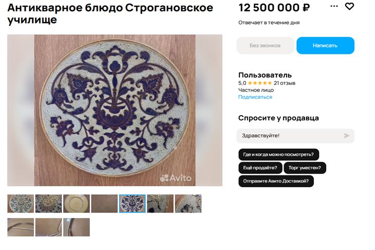 Волгоградец выставил на продажу старинное блюдо за 12,5 млн рублей. Как утверждает в объявлении продавец, тарелка была произведена на фабрике Строгановской керамики еще в Царской России.