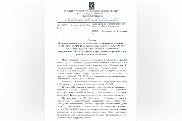 - Если отступления в работе от условий договора подряда или иные недостатки результата работы в установленный заказчиком разумный срок не были устранены либо являются существенными и неустранимыми, заказчик вправе отказаться от исполнения договора и потребовать возмещения причиненных убытков (пункт 3 статьи 723 ГК РФ). На основании этого принято решение об одностороннем отказе от исполнения государственного контракта от 15.12.2023 № 3248-23 на выполнение работ по объекту: «Ремонт автомобильной дороги «Кумылженская – Суляевский – Покручинский» км 22+798 - 3 5+900 в Кумылженском муниципальном районе Волгоградской области», - говорится в документе, размещённом 29 ноября на Госзакупках.