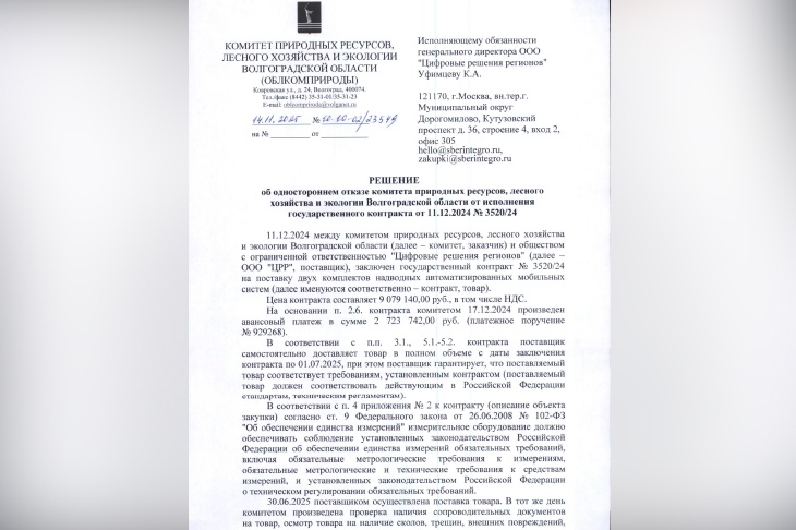 - Осуществлены выезды на различные водные объекты Волгоградской области в целях проверки работоспособности (функционирования) поставленных ООО "ЦРР" надводных автоматизированных мобильных систем, по результатам которых установлено несоответствие поставленных товаров метрологическим требованиям к достоверности (точности) измерений, при этом ранее выявленные недостатки и замечания не устранены, - сообщили в облкомприроды.