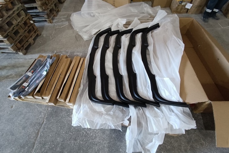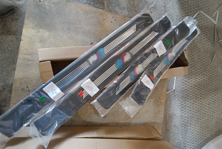 Среди задекларированных бамперов, дефлекторов, фар, накладок на противотуманные фары и под номера находились комплекты защитных накладок на пороги с нанесением известного товарного знака. 64 единицы полимерных накладок оказались контрафактными и будут конфискованы. Размер ущерба правообладателю составил более 650 тыс. рублей.