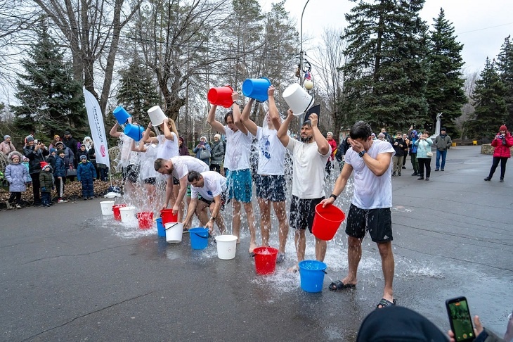 Показательные выступления устроили и волжские «моржи». Любители холодненького опрокинули на себя ведра с ледяной водой. Гостям раздавали бесплатно горячий чай с мятой и печеньем.