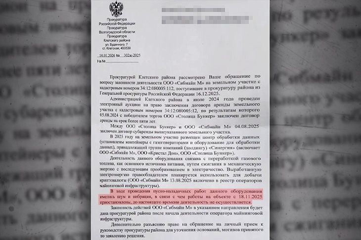 – В ходе проведения пусконаладочных работ данного оборудования имелись шум и вибрация, в связи с чем работы на объекте с 18.11.2025 приостановлены, до настоящего времени деятельность не осуществляется. Законность действий ООО «Сибма М» в указанном направлении будет дана прокуратурой района после начала деятельности оператора майнинговой инфраструктуры, – говорится в документе от 14 января 2026 года, с которым удалось ознакомиться редакции.