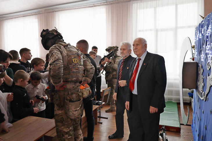 Вместе с делегацией ветеранов в интернете побывала и группа сотрудников Управления ФСБ России по ЛНР. Они провели с воспитанниками урок мужества. Бойцы продемонстрировали образцы стрелкового вооружения, применяемого российскими военными в зоне СВО.