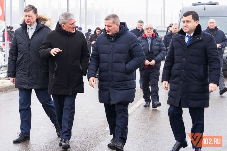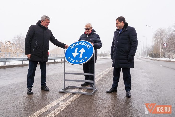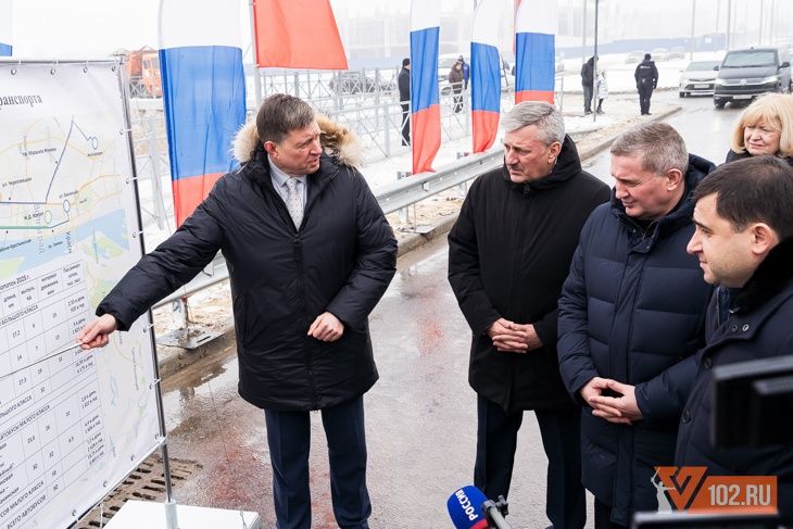 Стремительно возникшая суета и уборка в какой-то момент столь же быстро и неожиданно остановилась. На место открытия прибыли заместитель руководителя Минстроя Никита Стасишин и губернатор Волгоградской области Андрей Бочаров, а также представители региональной и городской администраций. Делегация сразу же направилась к стендам со схемой новой дороги.