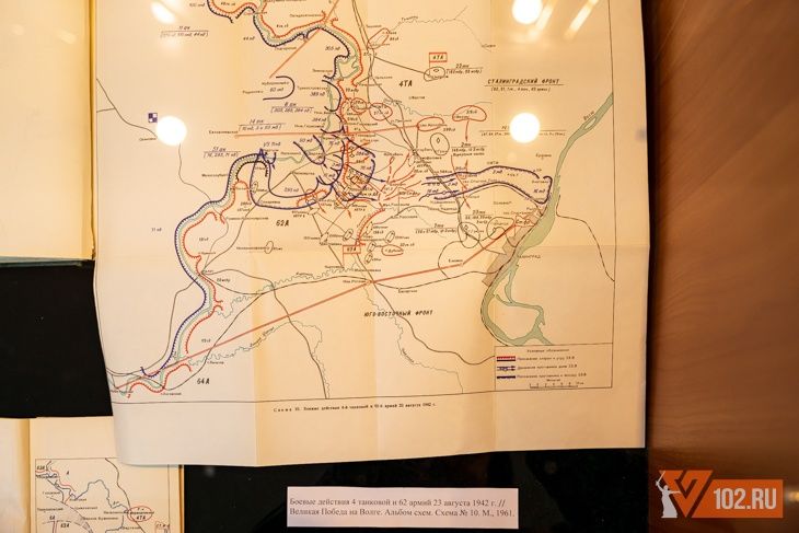 Враг подобрался к городу 23 августа 1942 года и с ходу рассчитывал взять Сталинград. На выставке представлена схема, отражающая планы немецко-фашистского командования разбить оборону райцентра концентрическими ударами.