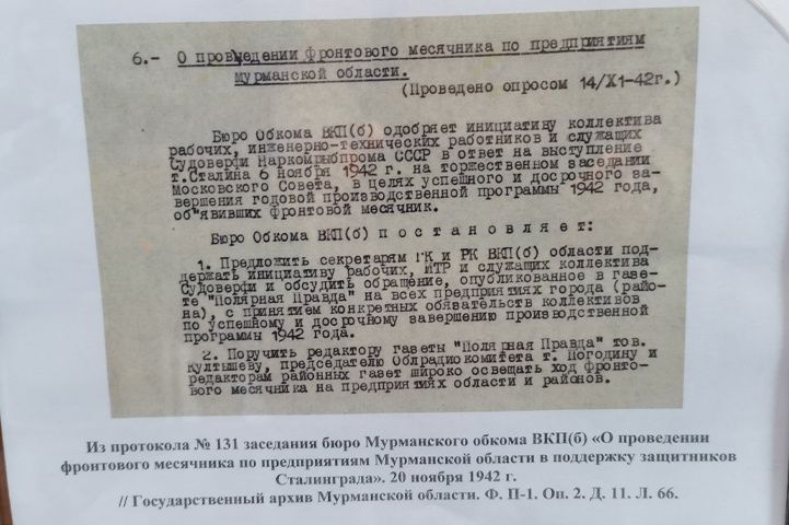 - На стенде представлено обращение коллектива мурманской судоверфи от 15 ноября 1942 года. Работницы прифронтового Заполярья объявили месячник стахановского движения в поддержку защитников Сталинграда. Также они направляли сталинградским бойцам открытые письма, в которых отмечали, что судоверфи в день удаётся сэкономить по 350 тыс. рублей, а к концу года они обязуются экономить по 500 тыс. рублей. Эти средства шли в фонд Защитников Сталинграда, - обратила внимание сотрудница архива.