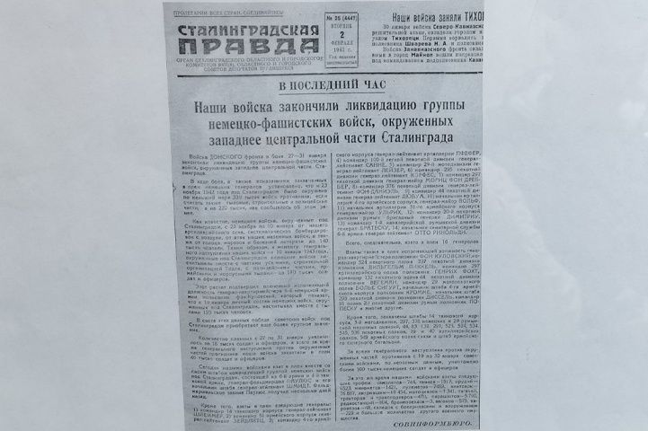 Документы о разгроме немецко-фашистской группировки под Сталинградом представлены редкими фотографиями и вырезками газет. В частности, посетители экспозиции могут ознакомиться с копией легендарного выпуска «Сталинградской правды» от 2 февраля 1943 года, где сообщалось о долгожданной победе.