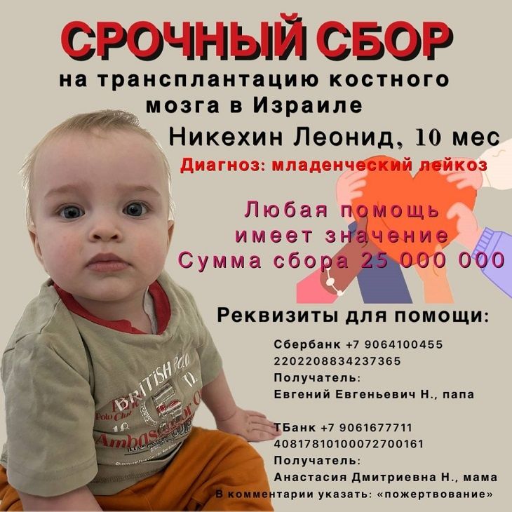 17 ноября 2025 года стал днем, который разделил жизнь семьи Никехиных из Волгограда на «До» и «После», как в самых страшных фильмах. Именно в этот день супруги узнали о том, что их 7-месячный Лёня тяжело болен. После череды обследований малышу поставили пугающий диагноз – младенческий лейкоз. Сейчас он и его мама Анастасия в НИИ им .Блохина, но продолжать лечение нужно в Израиле. Стоит спасение жизни мальчишки неподъемные для родителей 25 млн рублей.