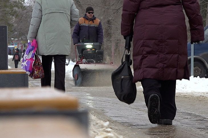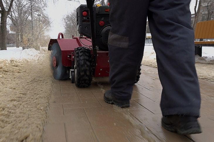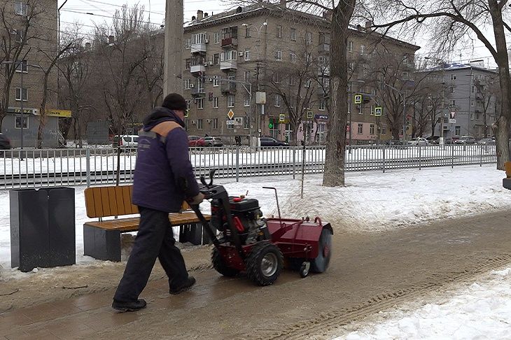 Максим Синицын, сотрудник МБУ ЖКХ Краснооктябрьского района, заводит современную машину с мощными щетками и выходит на тротуар, укрытый вязкой снежной кашей. Темные очки, серьезное лицо и мощная техника создают образ весьма брутального специалиста, бросившего вызов погоде.