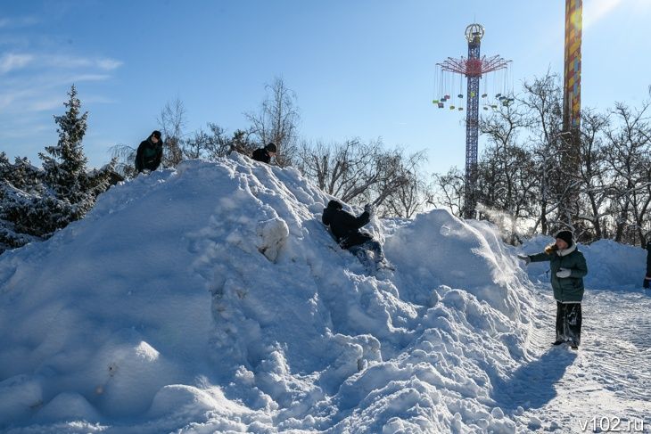На этой неделе снега выпало настолько много, что, похоже, его оказалось элементарно некуда складывать. То там, то здесь по городу стали вырастать временные площадки-накопители. Последние поспешили облюбовать школьники. Ученики штурмуют слежавшиеся айсберги, играют в снежки и скатываются с них на ледянках.