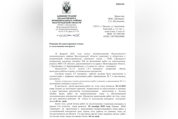 - Датой окончания работ по 4-му этапу является 01.12.2025 года. Однако до настоящего времени подрядчиком не представлены к приемке документы, подтверждающие выполнение в полном объёме работ. Просрочка по 4-му этапу превышает 60 дней. Более того, датой начала работ по заключенному сторонами контракту в рамках 5-го этапа является 2 декабря 2025 года. Однако ООО «Димиург» не приступило к выполнению соответствующего этапа работ, - говорится в решении об одностороннем отказе от исполнения соглашения.