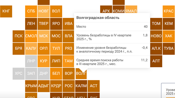 Отметим, что рейтинг РИА Новости построен на данных Росстата по итогам четвертого квартала 2025 года. По уровню безработицы на конец прошлого года Волгоградская область расположилась на 40-м месте. Приведенные данные свидетельствуют о снижении безработицы в регионе (-0,4 п.п.). Для сравнения: самое заметное снижение уровня безработицы произошло в Кабардино-Балкарии, где сокращение составило 2,5 процентных пункта, в Якутии (-2,2 п.п.) и в Чечне (-1,7 п.п.)