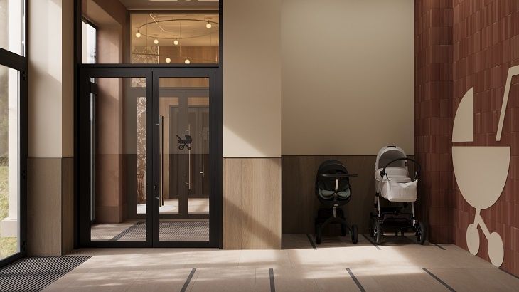 Подъезды здесь называют парадными не случайно. Высокие потолки, панорамное остекление, продуманный дизайн с интерьерными фонтанами и даже картинная галерея. А в жару вас встретит кондиционер — да, в холле теперь тоже будет свежо. Для удобства жителей в домах предусмотрены индивидуальные кладовые и общие колясочные, чтобы велосипеды и санки не занимали место в коридорах.