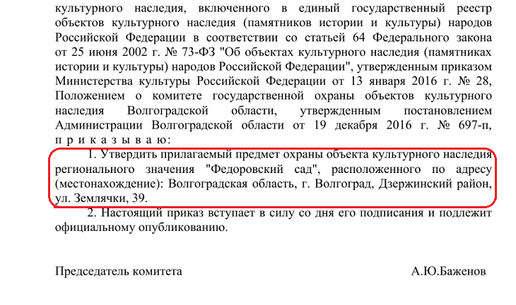 Согласно приказу облкультнаследия, расположен «Федоровский сад» в Дзержинском районе Волгограда на улице Землячки,...