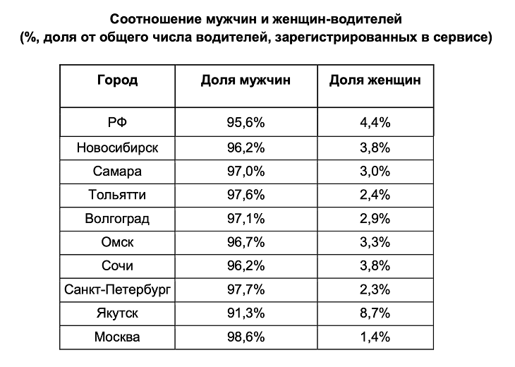 Согласно данным исследования, на сегодняшний день рынок такси по-прежнему остается преимущественно мужским: в целом по стране 95,6% зарегистрированных в сервисе водителей – мужчины, и только 4,4% – женщины. В Волгограде эти цифры составляют 97,1% и 2,9% соответственно.