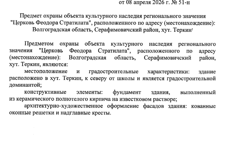 Церковь Феодора Стратилата в хуторе Теркин Серафимовичского района Волгоградской области признана объектом культурного наследия регионального значения. Об этом говорится в приказе Облкультнаследия, опубликованного на официальном интернет-портале правовой информации региона.