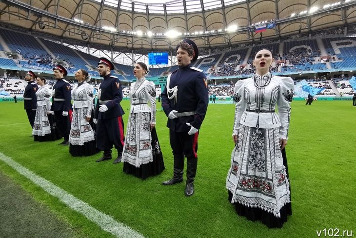 Зрители также перед матчем могли насладиться выступлением ансамбля казаков, разукрасить свои лица аква-гримом, а также сфотографироваться с человеком-газоном и ходулистами.