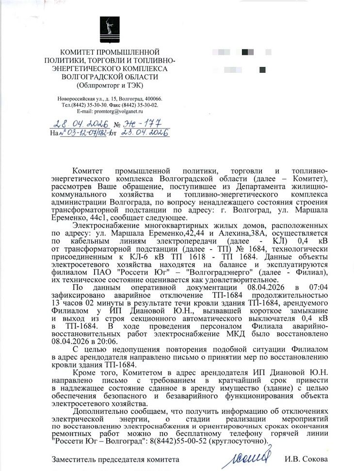 В последнее время аварийные отключения стали чаще из-за проливных дождей. В начале апреля три высотки снова оказались обесточенными из-за затопления трансформаторной подстанции. Люди жаловались во все инстанции. В конце апреля им пришел ответ из комитета промышленной политики, торговли и топливно-энергетического комплекса Волгоградской области.