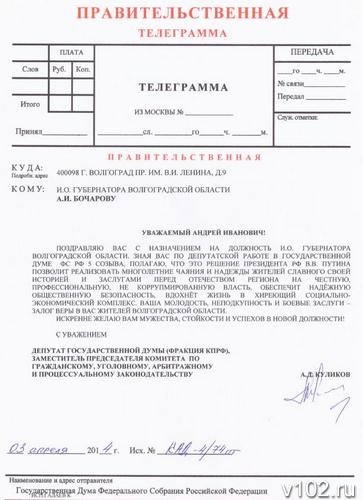 «Зная вас по депутатской работе в Госдуме Федерального собрания 5 созыва, полагаю, что это решение президента РФ В.В. Путина позволит реализовать многолетние чаяния и надежды славного своей историей и заслугами перед Отечеством региона на честную, профессиональную, не коррумпированную власть, - говорится в поздравлении. - Обеспечит надежную, общественную безопасность, вдохнет жизнь в хиреющий социально-экономический комплекс. Ваша молодость, неподкупность и боевые заслуги – залог веры в вас жителей Волгоградской области».