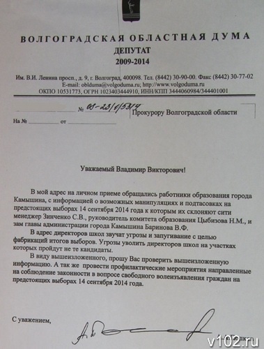Автор утверждает, что со стороны сити-менеджера Станислава Зинченко, замглавы администрации города Валентины Бариновой, руководителя комитета образования Натальи Цыбизовой в адрес директоров школ звучат угрозы уволить их, если на избирательных участках, которые они возглавляют, «пройдут не те кандидаты». Парламентарий просит также надзорные органы провести профилактические мероприятия, направленные на соблюдение законности в вопросе свободного волеизъявления граждан на предстоящих выборах.