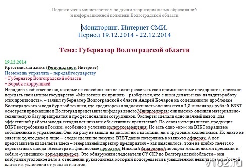 Впрочем, винить сотрудников министерства в таком «упущении» сложно, особенно исходя из того, какую титаническую работу им приходится проделывать каждый день. Так, например, объем мониторинга материалов и сюжетов, вышедших в интернет-изданиях, за 19-22 декабря 2014 года, составляет 498 (!) страниц, в печатных СМИ – 61 страницу, на радиостанциях – 14, на телевидении – 35. Другой вопрос: кто читает переписанные в ежедневном мониторинге информации и статьи, лишенные даже намека на какую-либо аналитику, и в чем эффективность такой работы? Неужто чиновники администрации Волгоградской области лишены возможностью пользоваться интернетом, и подобные мега-труды – это единственная для них возможность узнать, как регион прожил очередной день?