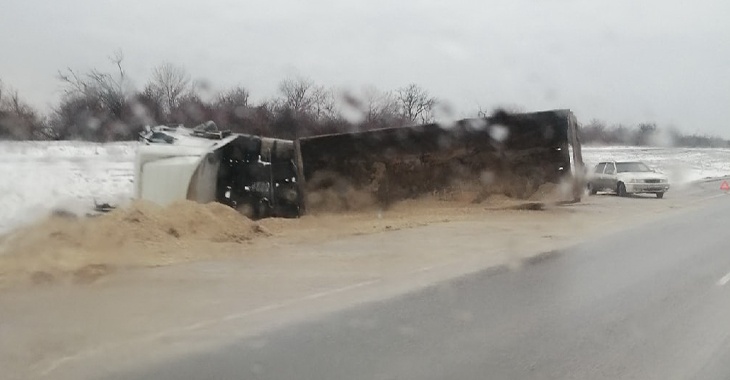 Р-22 во Фроловском районе. Водитель грузовика не справился с управлением, в результате фуру занесло и она опрокинулась. К счастью, ни сам